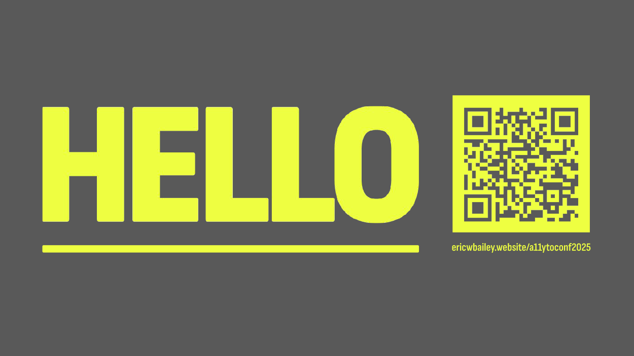 A copy of this talk can be accessed by using the QR code shown on screen, or by going to eric w bailey dot website forward slash a 1 1 y t o c o n f 2 0 2 5.