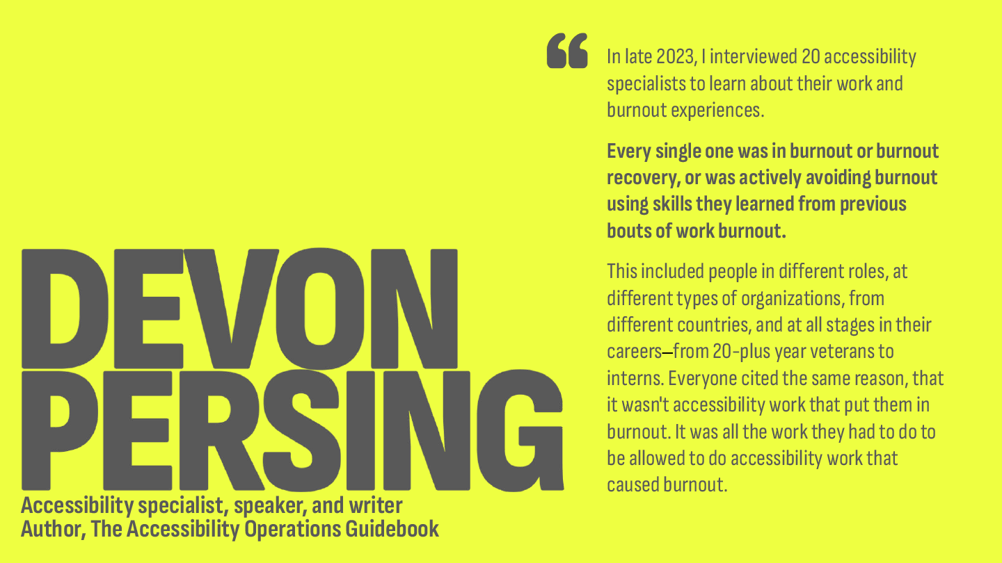 My friend Devon Persing was also researching this phenomenon. Their book, The Accessibility Operations Guidebook, is an excellent resource for how to combat burnout as an accessibility professional and make your efforts more sustainable.