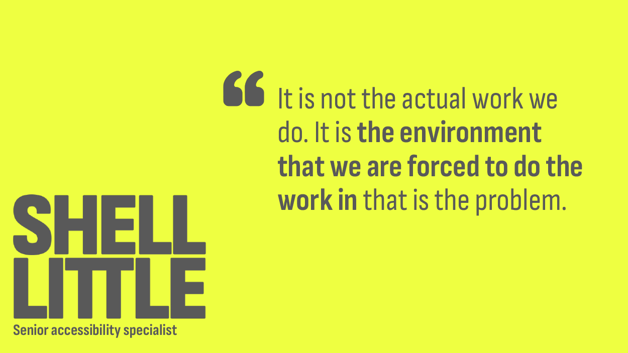 To that point, I’d also like to quote senior accessibility specialist Shell Little. It’s from her excellent talk, The Accessibility to Burnout Pipeline.