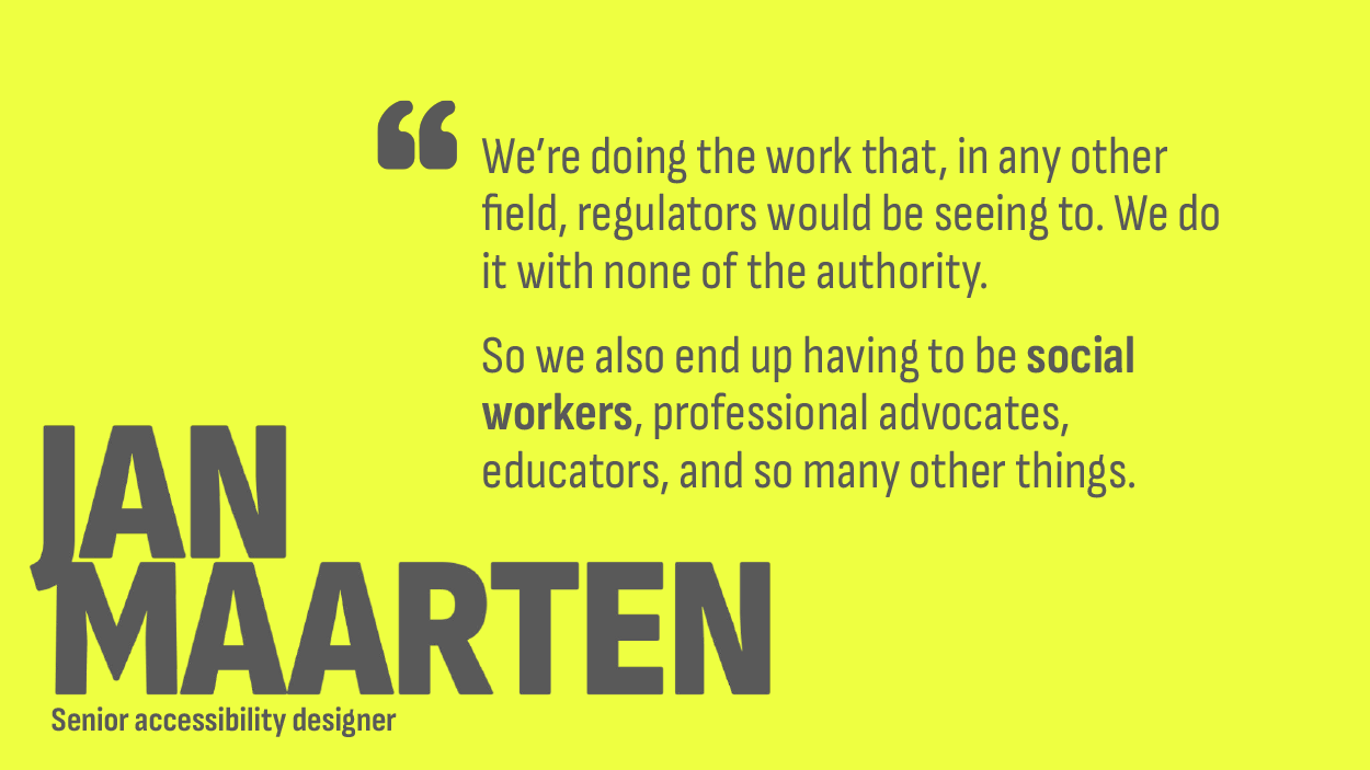This included people in different roles, at different types of organizations, from different countries, and at all stages in their careers—from 20-plus year veterans to interns. Everyone cited the same reason, that it wasn't accessibility work that put them in burnout. It was all the work they had to do to be allowed to do accessibility work that caused burnout.