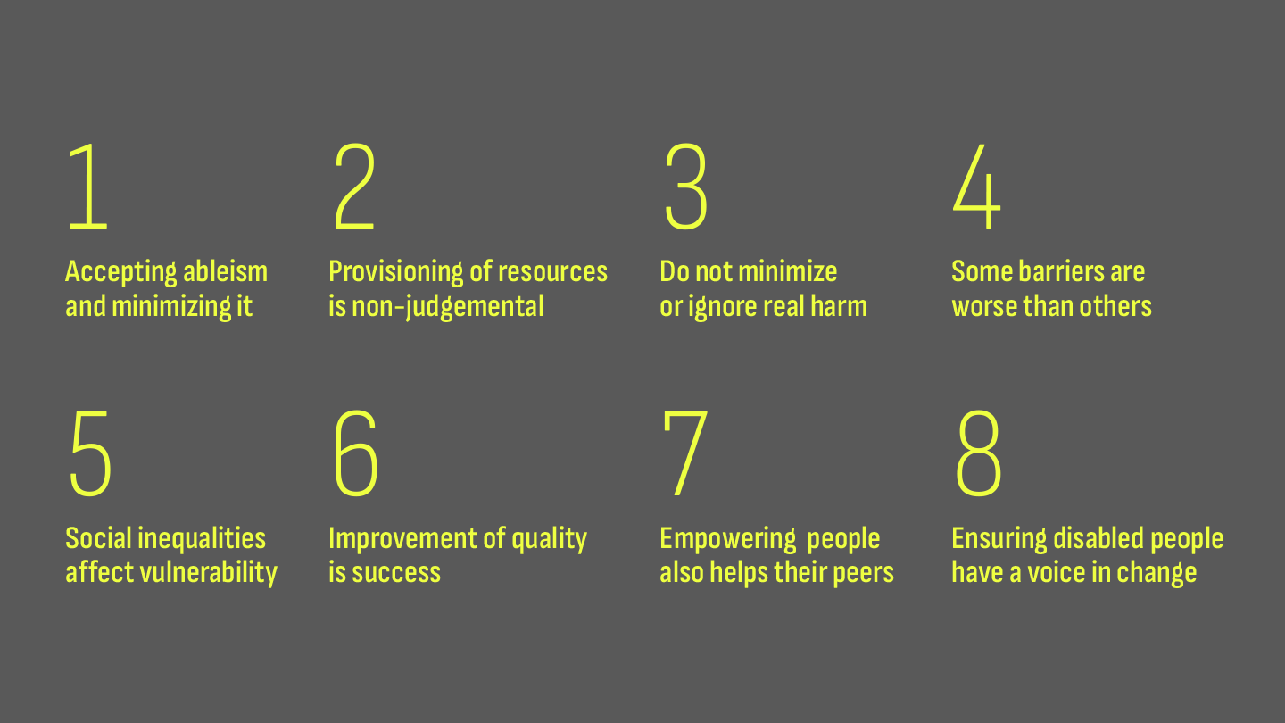 We are intentionally including perspectives of disabled people as part of this work—not as extractive resources or as tokenized chess pieces for organizational politics—but instead as peers.