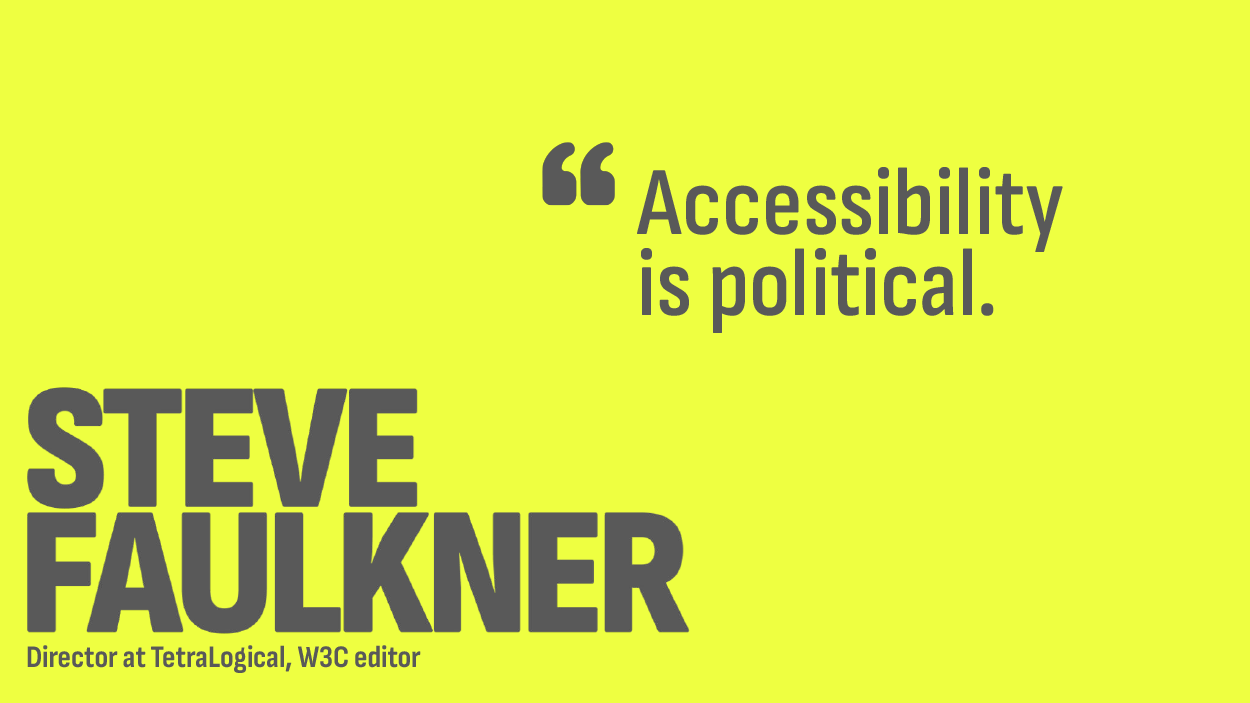 “Accessibility is political.” That’s a drumbeat of a message that you’ll hear from Steve Faulkner, Director at TetraLogical and W3C spec editor.