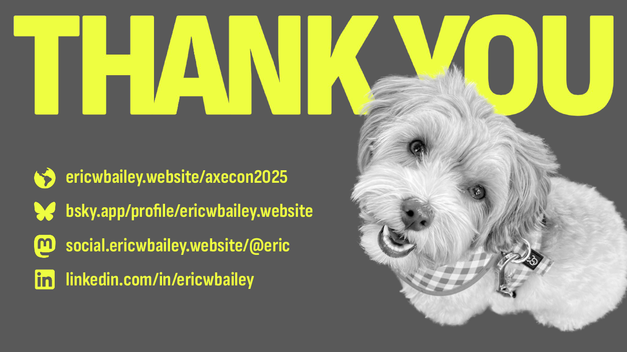This talk, including the references and resources displayed, and the background research that went into it are listed on my site, which is eric w bailey dot website forward slash a 1 1 y t o c o n f 2 0 2 5. There are also ways to contact me there, including, Bluesky, Mastodon and regrettably, LinkedIn.